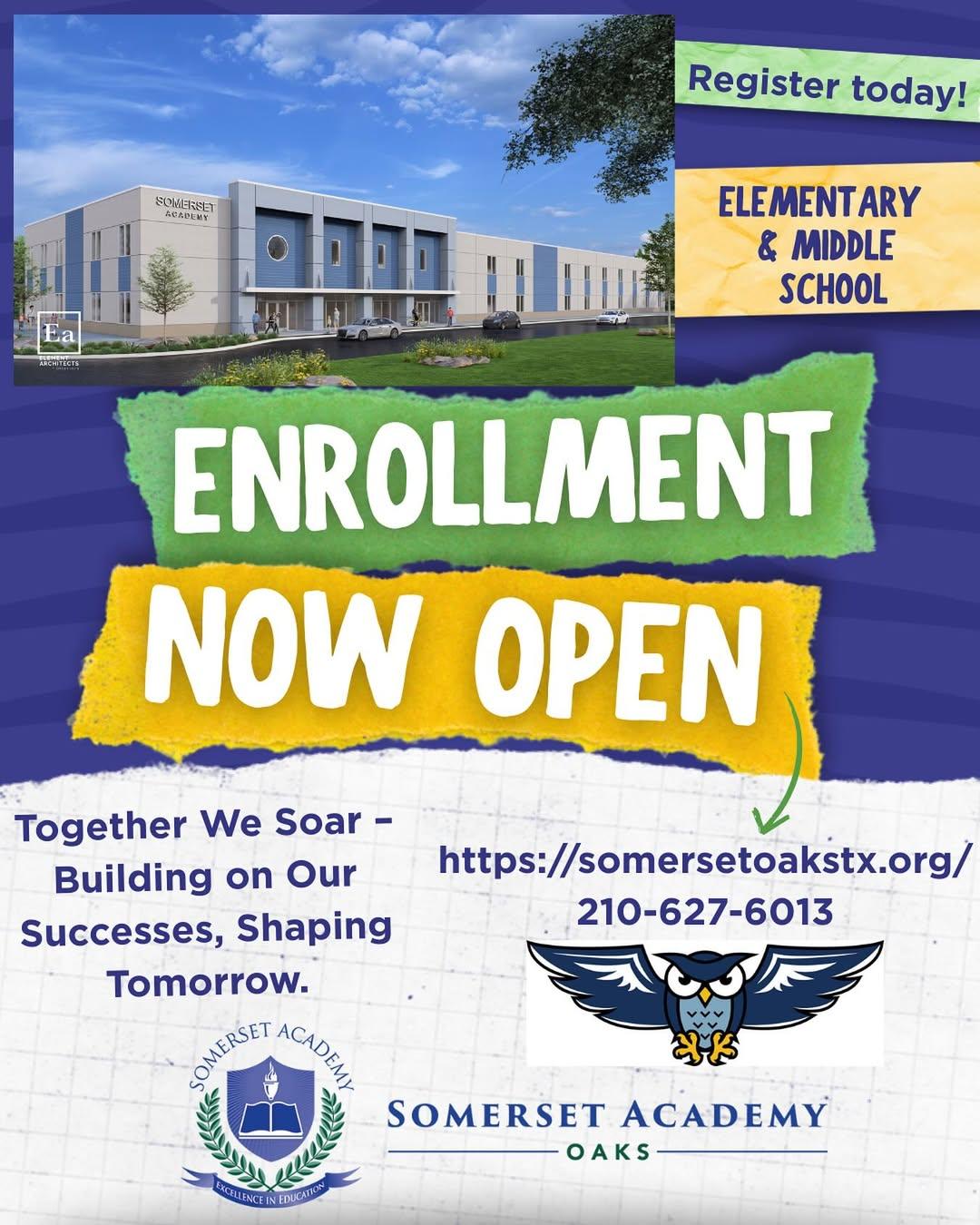 Somerset Academy Oaks is still enrolling for the 2025-2026 School Year. New enrollment is now being processed directly with our registrar. Please contact Jessica Gonzalez at jessica.gonzalez@somersetacademytx.org to complete the registration process. Applications for the 2026-2027 school year will become available on October 1st, 2025.